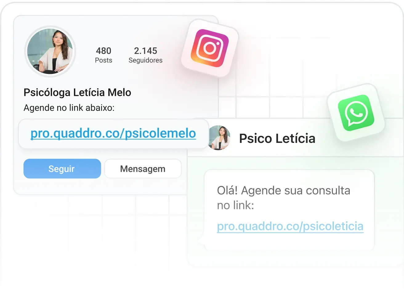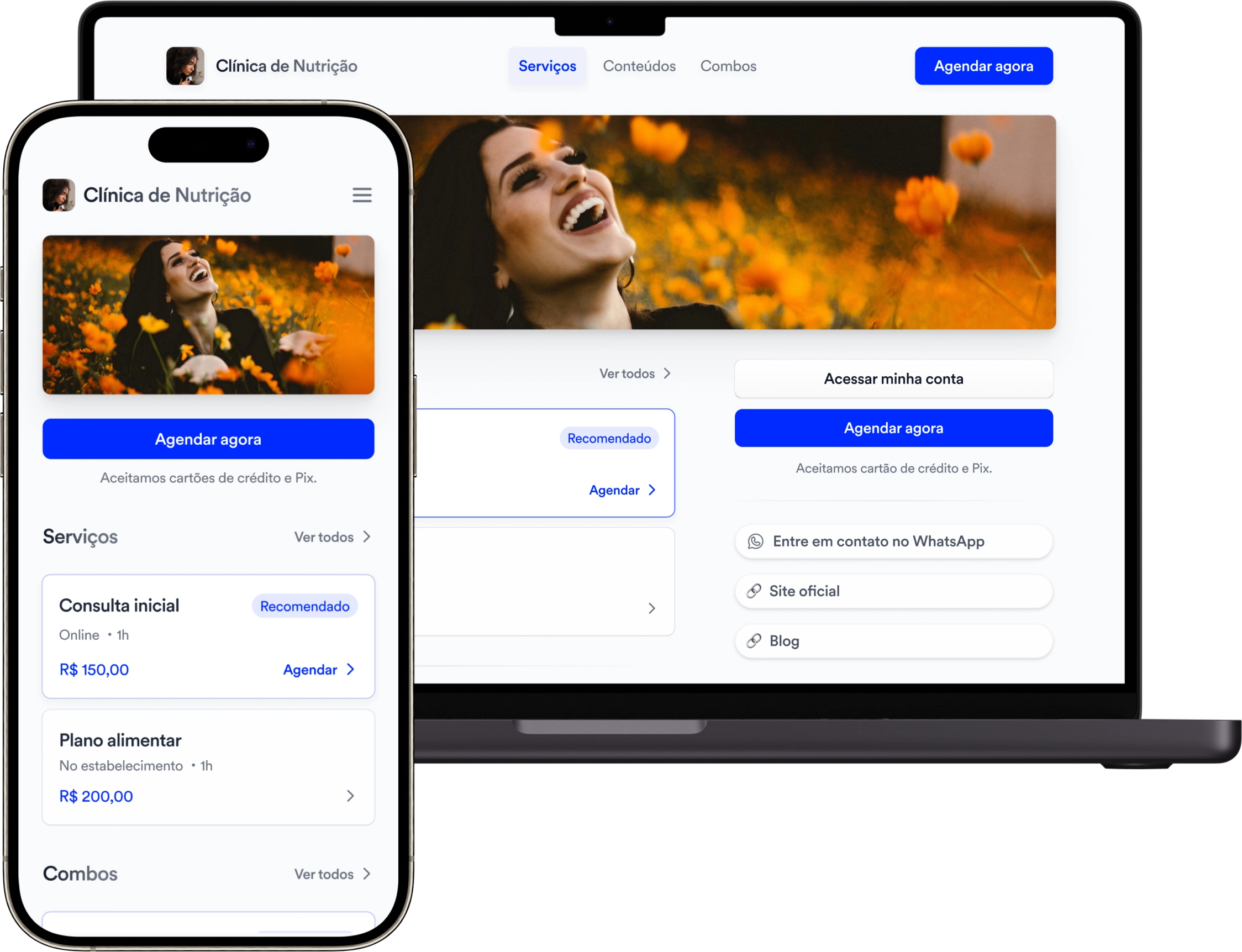 Em poucos passos, você terá um site exclusivo para seu negócio, onde seus clientes poderão agendar com você, sem necessidade de baixar um app, apenas entrando no link da sua página. Divulgue esse site em sua bio do Instagram e na resposta automática do WhatsApp Business e não se preocupe mais em perder clientes por falta de resposta ou em perder horas da semana trocando mensagens.